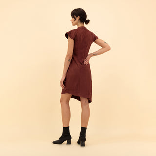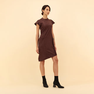 The Asymmetric Suede Midi Dress in a rich black hue blends soft suede with a bold asymmetric hemline for effortless sophistication. Featuring cap sleeves and practical side pockets, it’s perfect for versatile styling from day to night.
